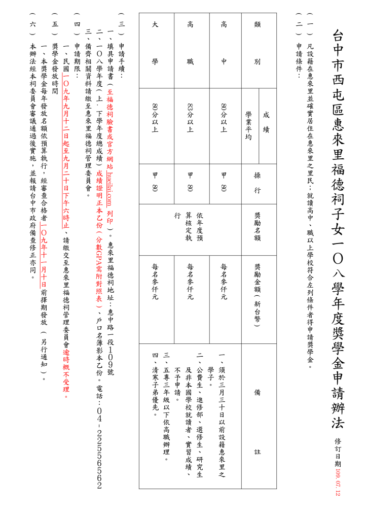 109年獎學金申請辦法 分類:hueilai_taichung2020-07-162020-07-31發表於未分類 109年(108學年度)獎學金申請表單下載: 惠來里福德祠108學年度獎學金申請表下載 分享此文: 分享到 X(在新視窗中開啟) X 分享到 Facebook(在新視窗中開啟) Facebook 喜歡 正在載入... 相關