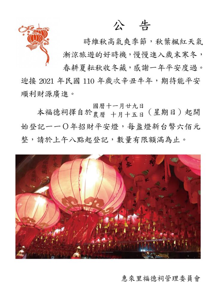 本福德祠擇自於國曆十一月廿九日(星期日)農曆 十月十五日起開始登記一一O年招財平安燈,每盞燈新台幣六佰元整,請於上午八點起登記,數量有限額滿為止。